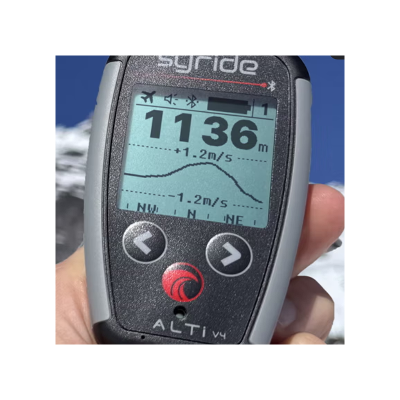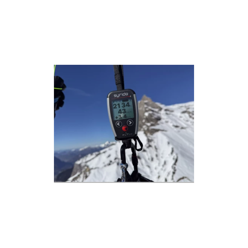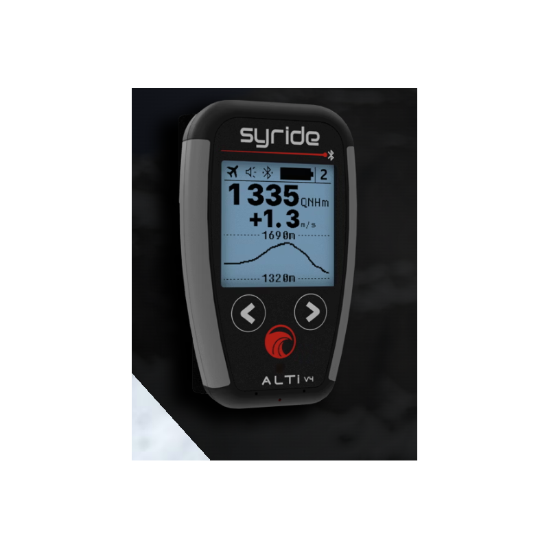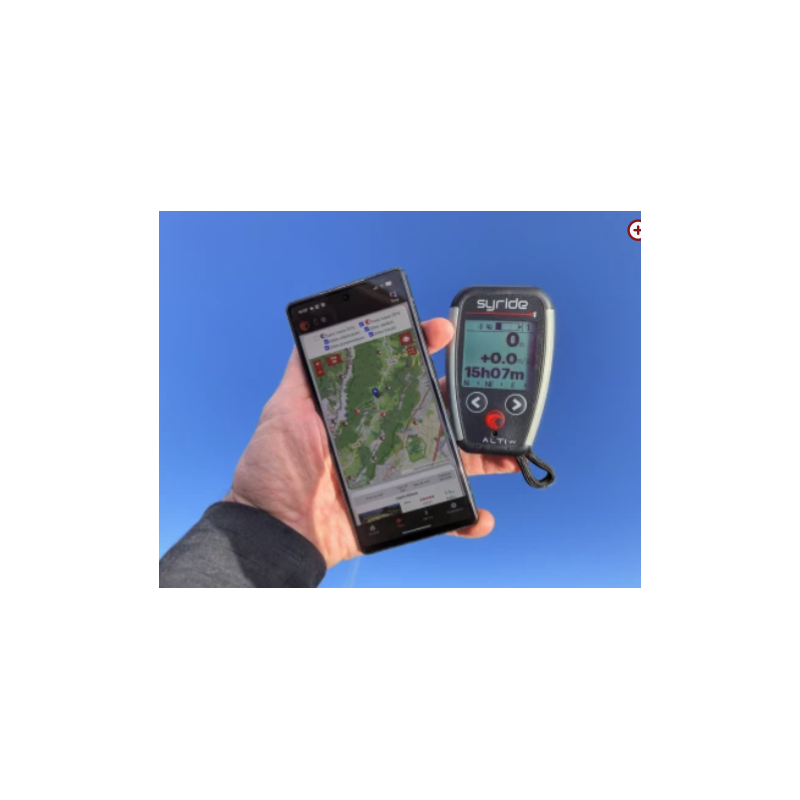 Connecté à l’application Syride Link, l’Alti V4 peut afficher les informations GPS provenant de votre téléphone, telles que la vitesse sol, l'altitude GPS ou les coordonnées, combinant précision barométrique et données GPS de votre téléphone.