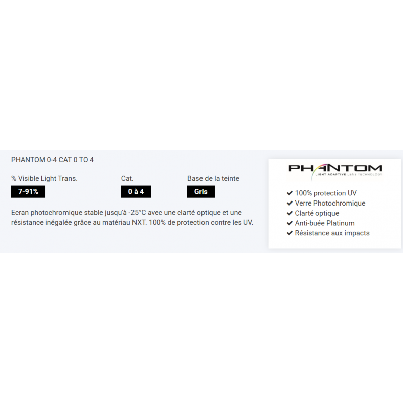 Meilleur verre du marché, Phantom est un verre photochromique doté d’une clarté optique spectaculaire. La technologie de verre Phantom couvre une grande plage de transmission de la lumière visible, assurant une acuité visuelle précise dans toutes les conditions météorologiques, même les plus extrêmes. La teinte change avec la lumière de la catégorie 0 à 4 pour une vision améliorée quelles que soient les conditions climatiques.