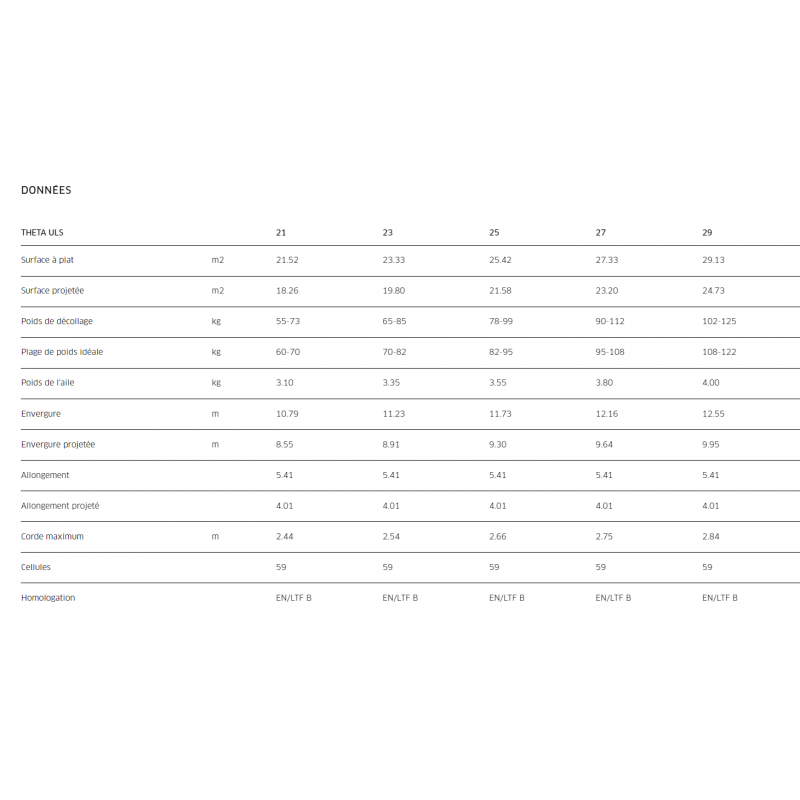 Les Seamless Weight Ranges de la THETA ULS permettent une continuité d'une taille à l'autre, de sorte que chaque pilote se trouve dans la plage de poids idéale. Ainsi, la THETA ULS fournit le rapport optimal entre vitesse de vol et taux de montée dans toutes les conditions de vol.