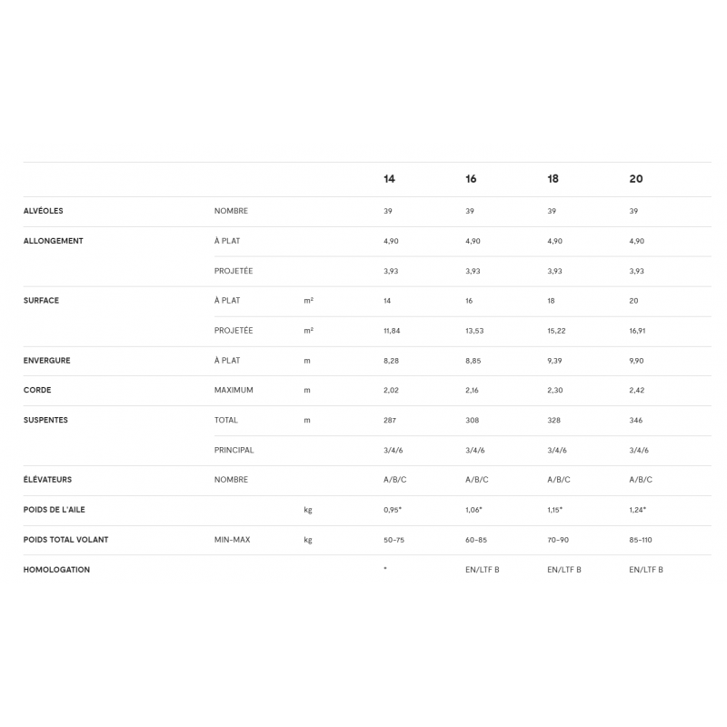 POIDS DE L'AILE | kg | 0,95* | 1,06* | 1,15* | 1,24* | |